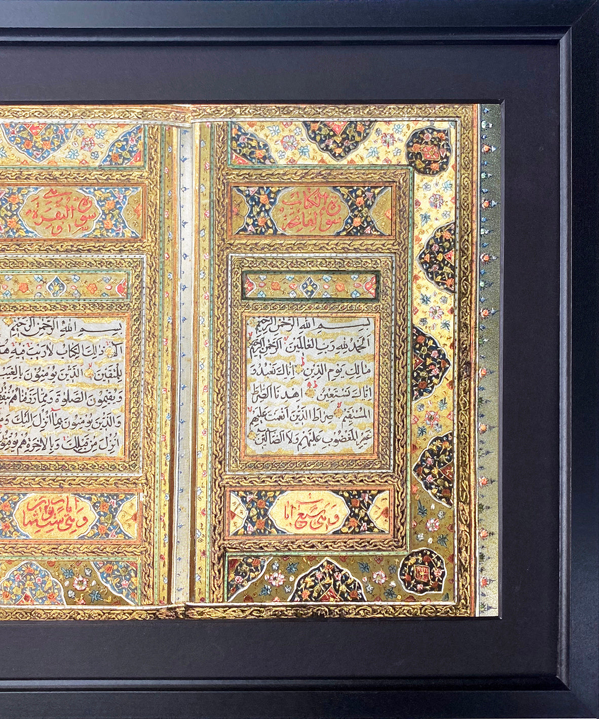 Encased behind glass in a sleek black wooden frame, this piece is ready for wall mounting or tabletop display, making it a meaningful and visually stunning tribute to Islamic tradition and faith.