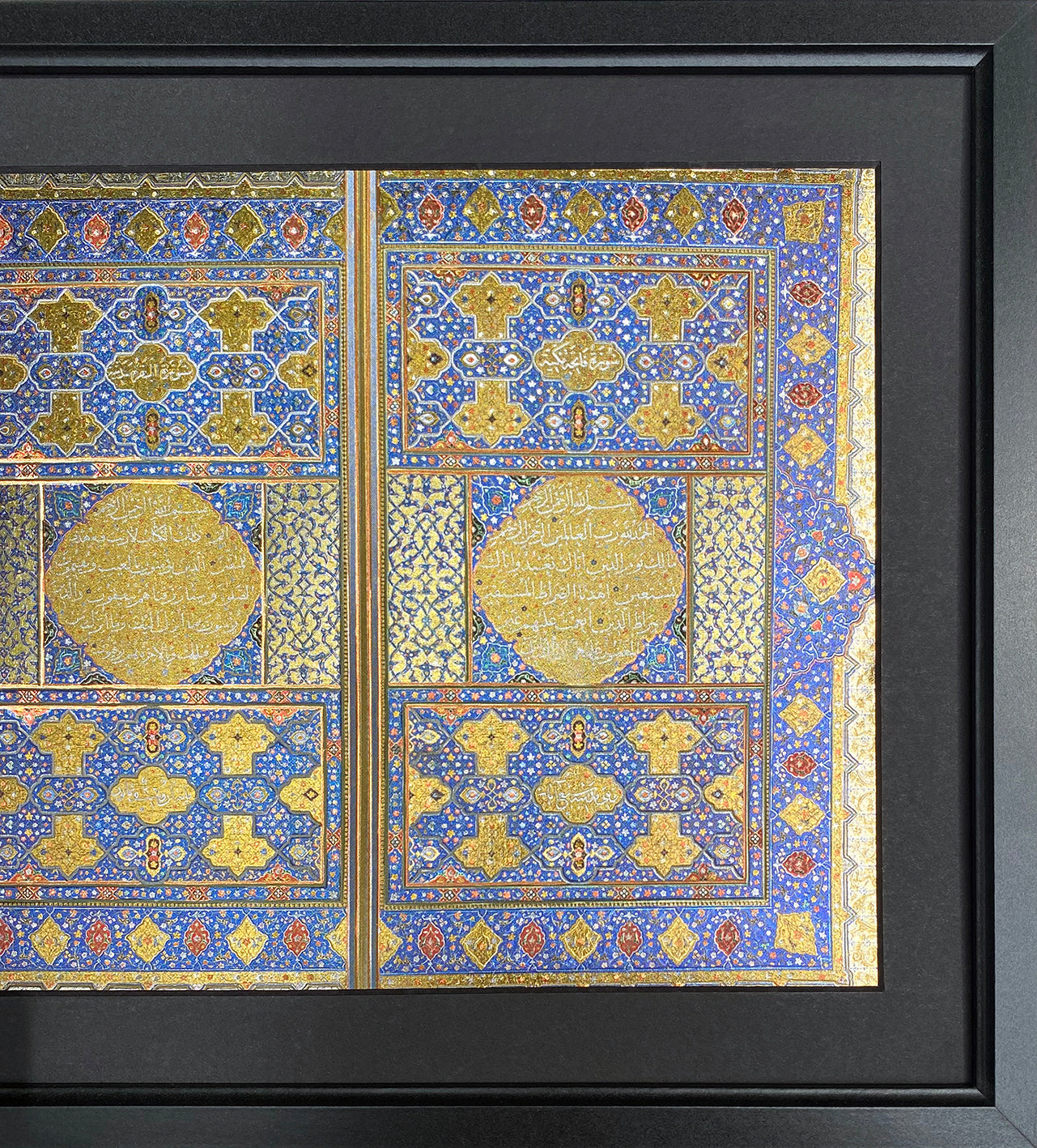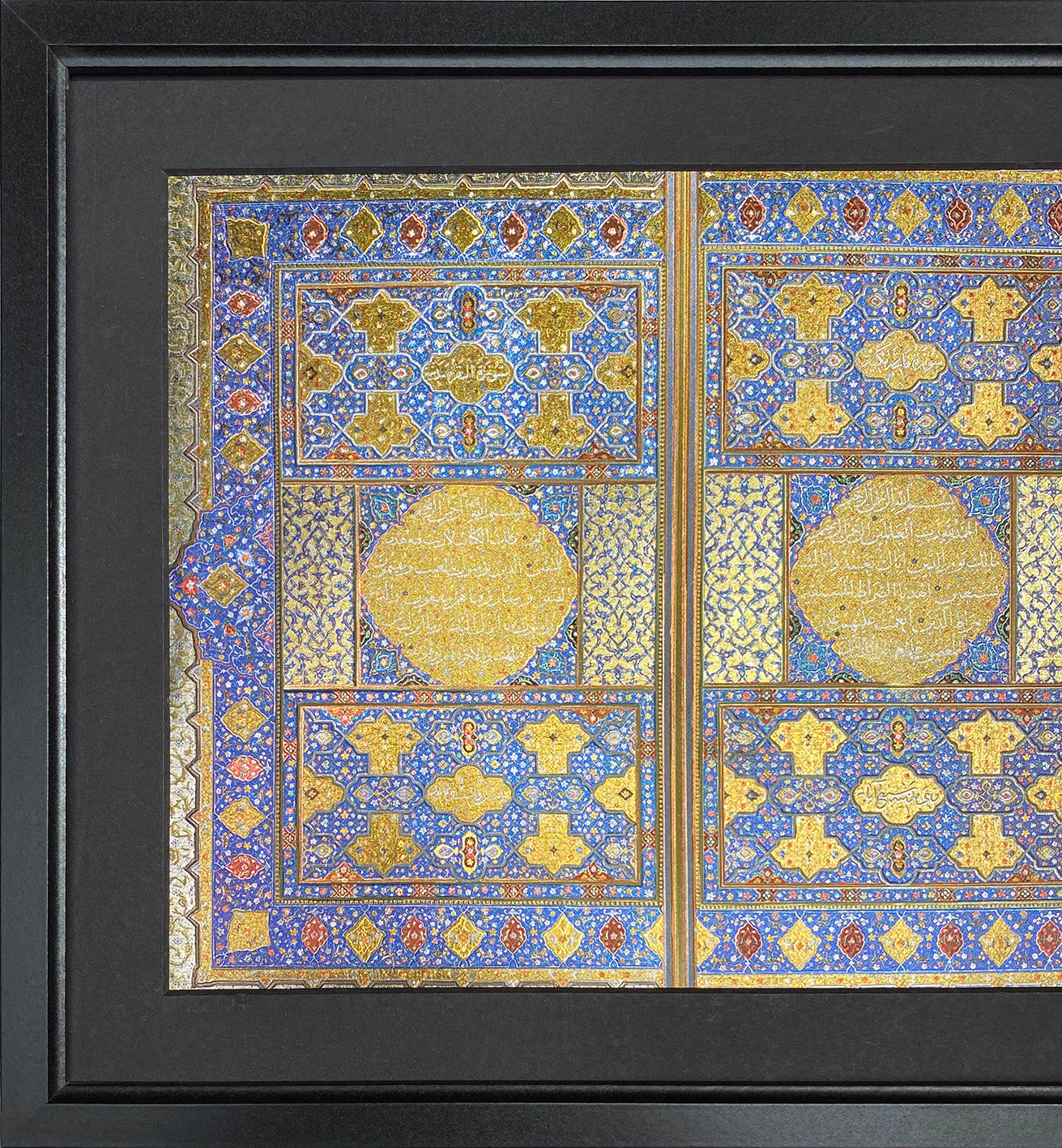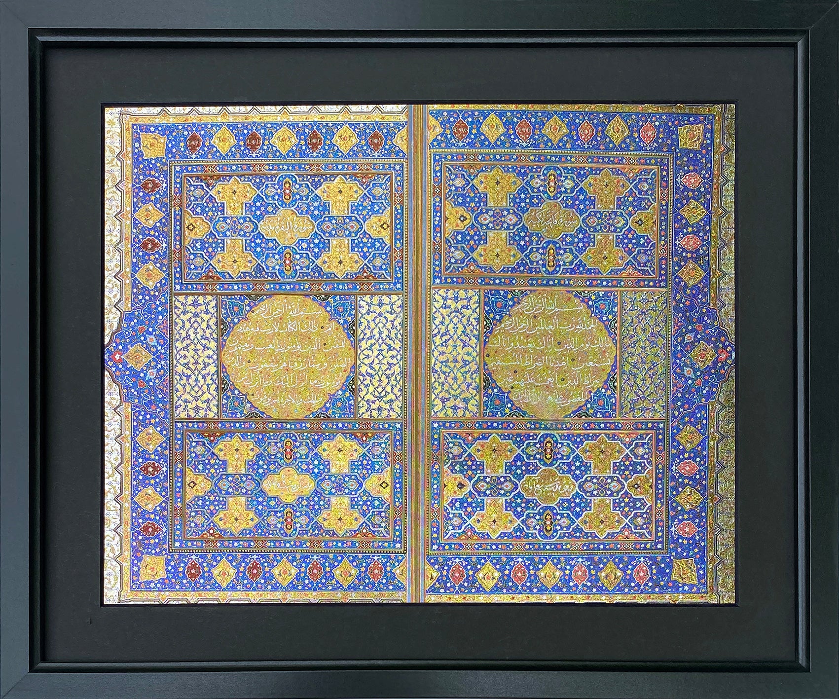 Encased behind glass in a sleek black wooden frame, this piece is ready for wall mounting or tabletop display, making it a meaningful and visually stunning tribute to Islamic tradition and faith.