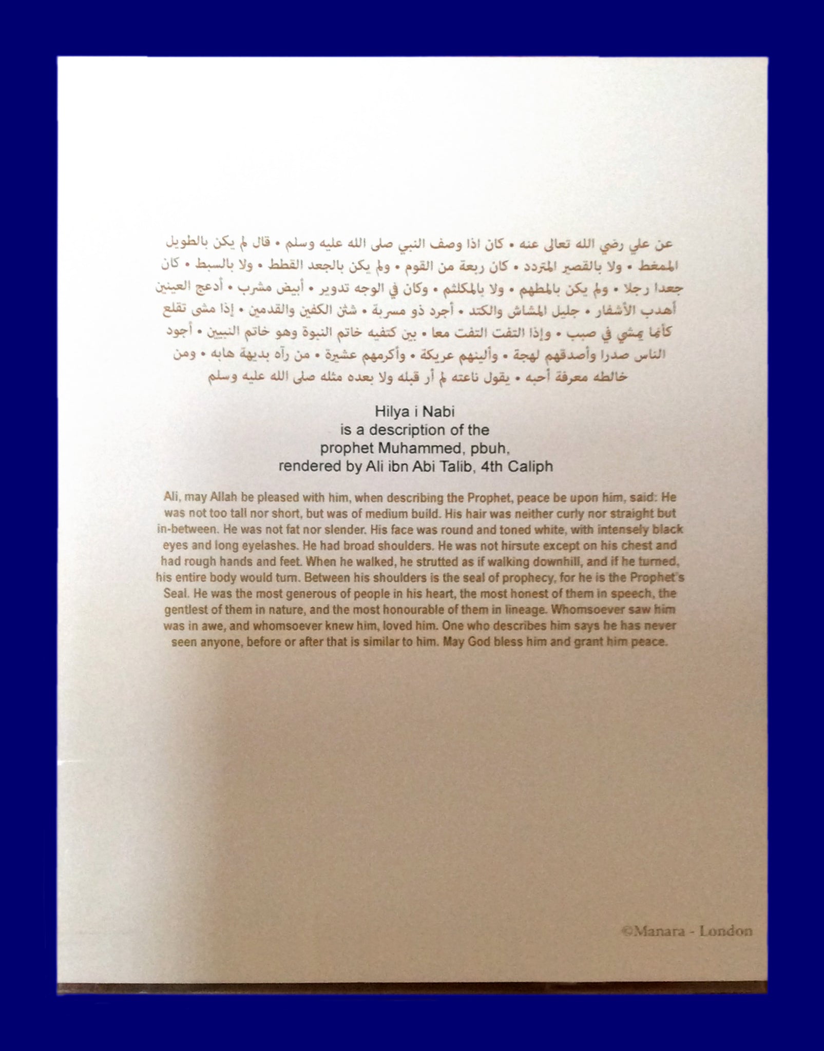 A magnificent display stand of a work depicting a description of the Prophet Muhammad as rendered in a Hadith, by Ali ibn Abi Talib, 4th Caliph in the 1st Hijra century (7th century CE).