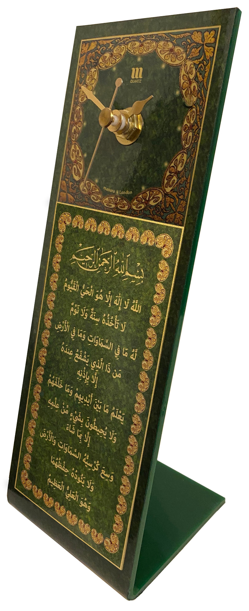 The stand displays Surat al Kursi from the Holy Quran in gold lettering.